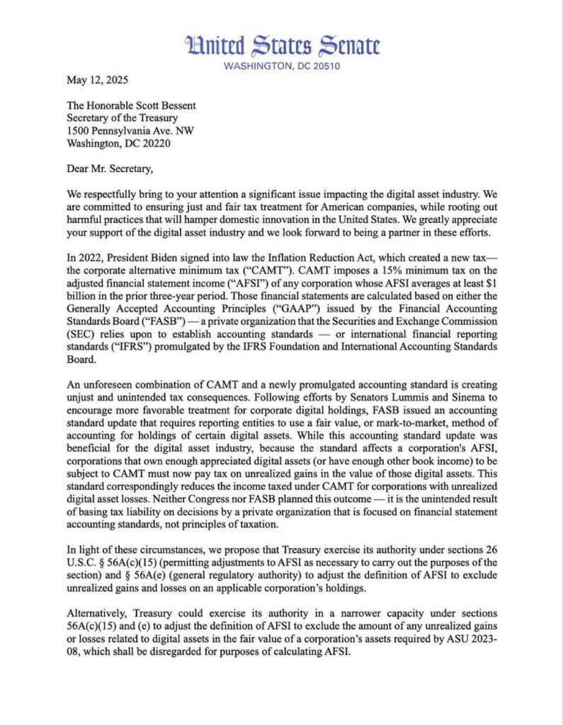 เมื่อวันที่ 12 พฤษภาคม 2025 คณะกรรมาธิการการเงินแห่งวุฒิสภาสหรัฐฯ ได้ส่งจดหมายถึงกระทรวงการคลัง โดยเสนอให้ปรับปรุงระบบภาษี CAMT เพื่อหยุดการเก็บภาษีจาก “กำไรที่ยังไม่ได้รับรู้” (unrealized gains) ของบริษัทที่ถือสินทรัพย์ดิจิทัล